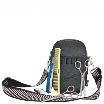 Lässig um die Hüfte oder modisch quer über der Brust getragen, bietet die Crossbag mit breitem Gurt Platz für vier Scheren und alle weiteren benötigten Tools. Alle Scheren tragen einen farblich passenden Akzent mit Fingerringen in der Farbe Rosé.