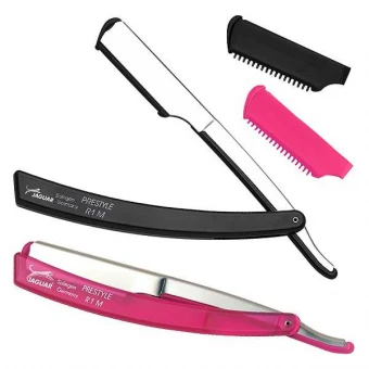 Zum Schneiden, Rasieren und Effilieren. Aus Kunststoff mit Metall verstärktem Klingenhalter, passend für jede handelsübliche Rasierklinge. Lieferung mit Effilierkamm und Rasierklinge.