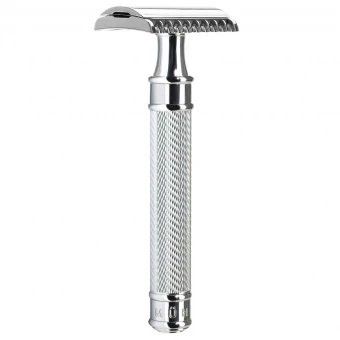 Noch traditioneller ist nur das Rasiermesser: Für den MÜHLE Rasierhobel mit offenem Zahnkamm bedarf es eindeutig Fingerspitzengefühl. Die vergleichsweise breite Zahnung und eine flache Positionierung der Klinge bewirken eine äußerst direkte und offensive Rasur – drahtigere und längere Barthaare lassen sich somit leichter erfassen und abschneiden. Für Fortgeschrittene und Profis, die beim täglichen Pflegeritual genau wissen, was sie tun.